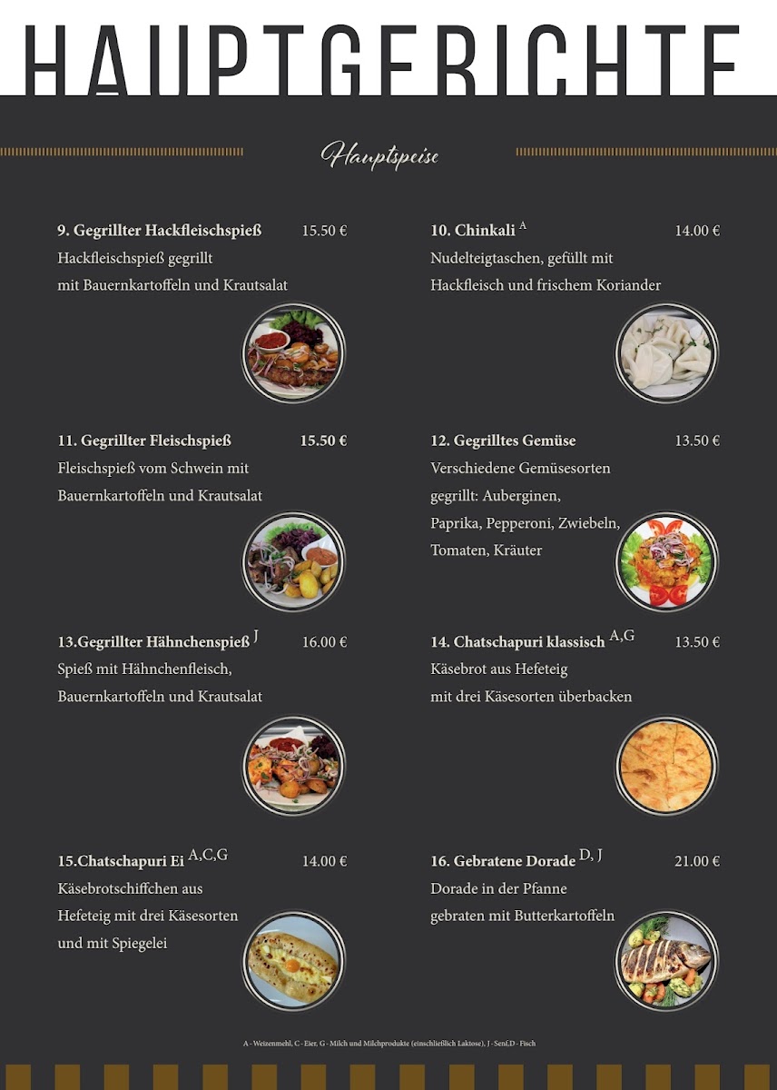 Guests can discover hearty grilled specialties like tender lamb, chicken, and minced meat skewers served alongside rustic potatoes and fresh salads. Delicate dumplings such as Chnkali add a satisfying, homemade touch, while dishes like Gebackene Dorado provide a flavorful option for fish lovers. The menu also features classic Armenian sides and salads, including various fresh and pickled vegetables that complement the main courses well.